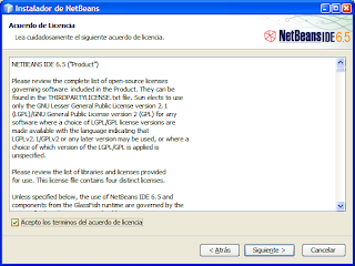 Hay que destacar que para realizar la instalación de este entorno de desarrollo hay que tener previamente instalado el kit de desarrollo de Java. Si no se tuviera instalado, en la parte inferior de la ventana de bienvenida se mostraría un error. (La descarga del kit de desarrollo de Java JDK se puede realizar también gratuitamente desde la página de descargas de Sun o directamente desde aquí para la versión SE 6u12: Java SE Development Kit 6u12).