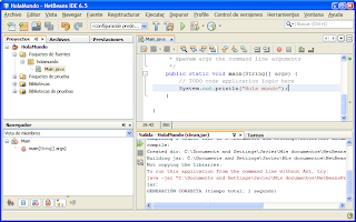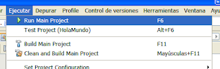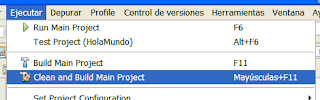 Ahora es el momento de compilar el código escrito, para lo que se dispone en el menú Ejecutar de las opciones Build Main Project que realiza el proceso de compilación, o de Clean and Build Main Project que además de compilar realiza previamente una limpieza de cualquier compilación anterior. Por tanto, optaremos por una de estas soluciones.