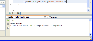 En el primer programa que se va a desarrollar únicamente debe mostrarse en pantalla el típico mensaje "Hola mundo". Por lo que se escribirá en ese lugar la orden: