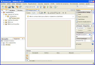 Al terminar aparece el entorno de desarrollo de NetBeans, donde en la parte central se encuentre la ventana vacía como un recuadro gris con borde naranja. Sobre ese espacio se irán colocando los componentes que formarán parte de la ventana.
