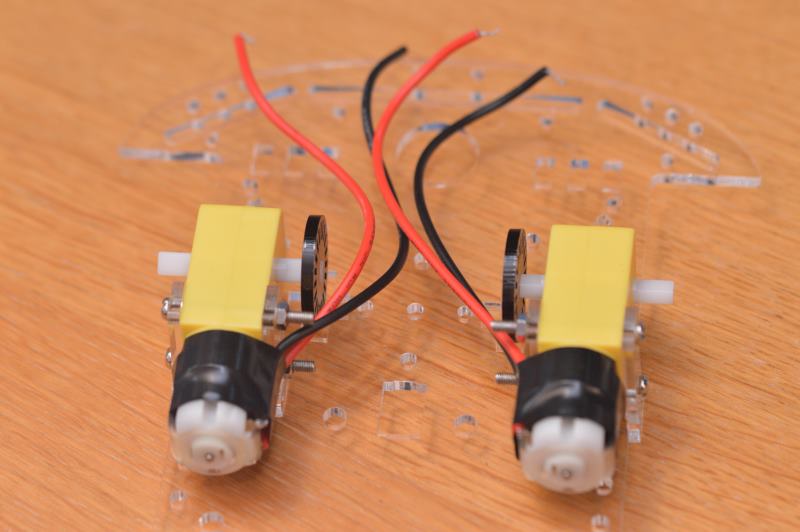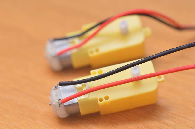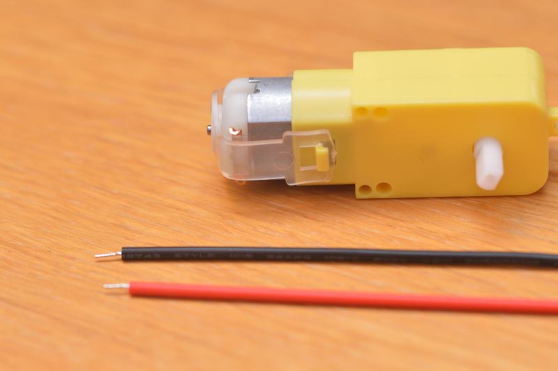 Suelda los cables rojo y negro que vienen en el kit del chasis a los motores. En principio no importa en qué patilla del motor sueldas el cable rojo o el negro, ya que después se podría cambiar el sentido del giro desde la aplicación que se programe o en las conexiones que se harán a las tarjetas controladoras, pero lo mejor es mantener el mismo orden para ambos motores.