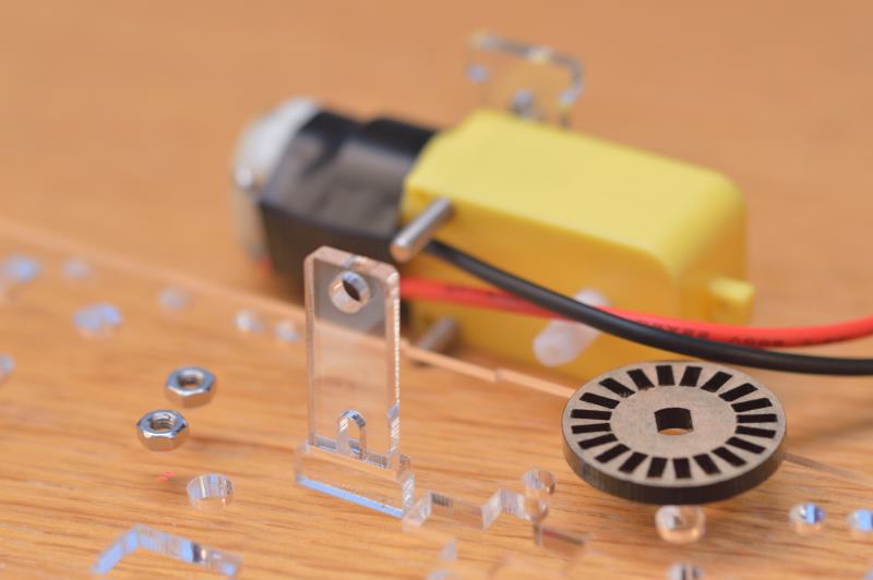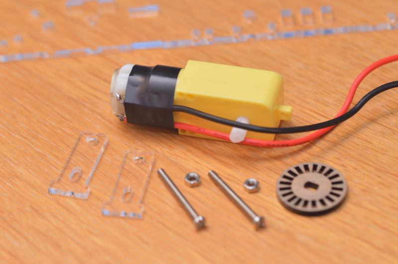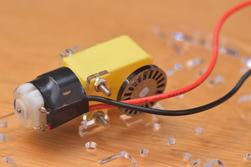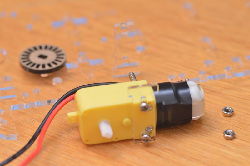 Termina de unir los dos soportes usando los tornillos y sus tuercas de manera que quede bien fijado el motor al chasis. Asegúrate de que el soporte externo se apoya correctamente en la muesca del chasis. Encaja también en la parte interior del eje la rueda pequeña agujereada que se podría utilizar de velocímetro, aunque en este caso no se va a utilizar.