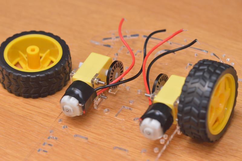 Termina de colocar los dos motores de la misma manera a ambos lados del chasis y encaja las ruedas en los ejes por la parte exterior.