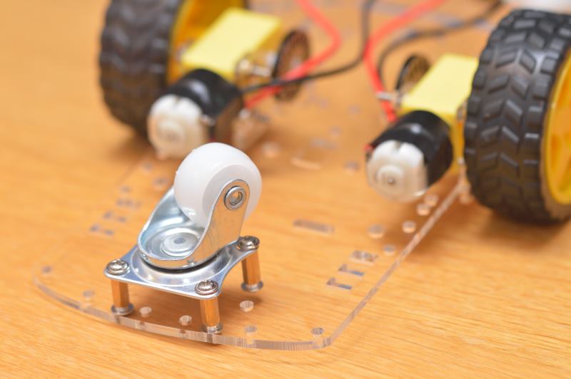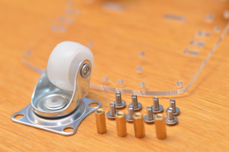 Ahora podrías colocar la rueda loca que sirve de apoyo en la parte trasera. Utiliza los 8 tornillos de la imagen y las 4 tuercas de extensión que se deben colocar por lo que será la parte inferior del chasis (donde quedan los motores).