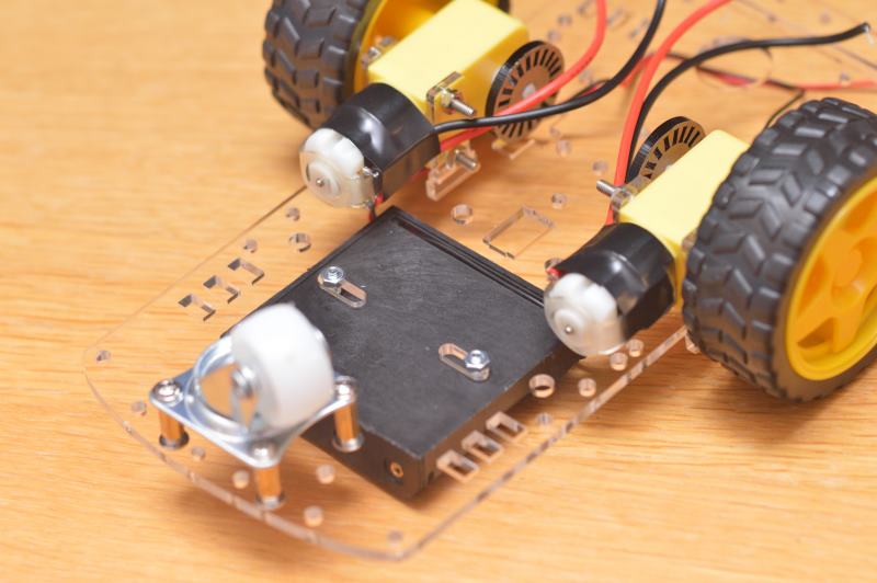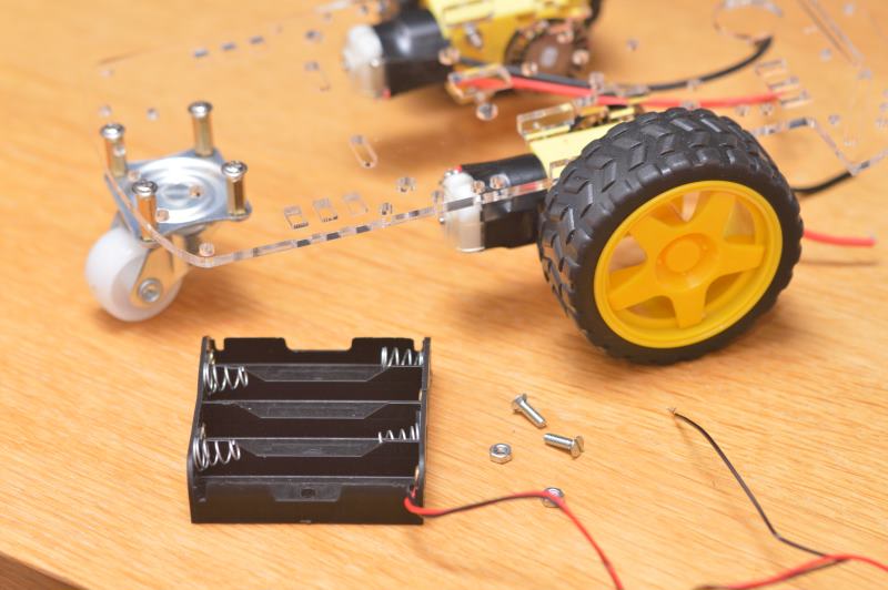 Para fijar la caja puedes usar un par de tornillos M3x10 o más largos, con cabeza avellanada para que no choquen con las pilas, pero ten en cuenta que no vienen en el kit. En Leroy Merlin se pueden encontrar, por ejemplo.
