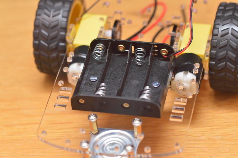 Coloca a continuación el soporte para las pilas. A partir de ahora no hay un sitio exacto donde colocar los siguientes elementos en el chasis, por lo que aquí se proponen unas fijaciones, pero quizá tú mismo puedas encontrar otras ubicaciones mejores, o quizá en el chasis que hayas adquirido cambien los agujeros y debas buscar otras ubicaciones. En este caso se va a colocar el soporte de las baterías en la parte trasera, aprovechando los dos agujeros longitudinales.