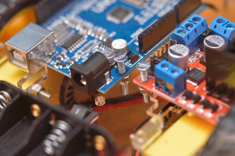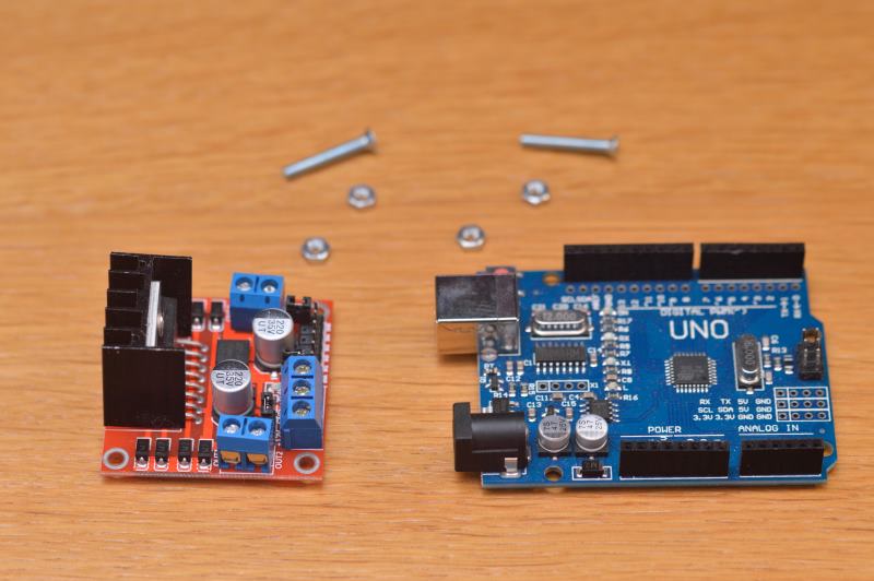 Deberás fijar la tarjeta Arduino y la placa controladora de los motores L298N (la roja más pequeña) buscando la mejor colocación posible en el espacio que vaya quedando y algún agujero que coincida con los de las placas para utilizar algún tornillo que las sujete. Deberás usar tornillos M3x15 o M3x20 que no vienen con el kit.