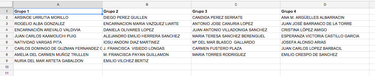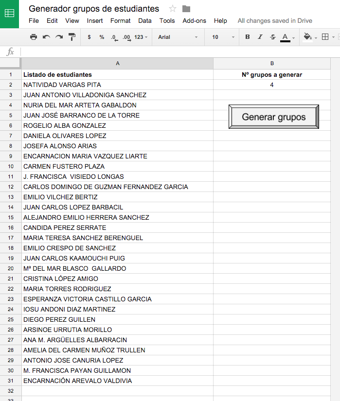 Permite generar una serie de grupos aleatorios, cuyo número se puede especificar, a partir de un listado de los nombres de los estudiantes. Cambia la lista de estudiantes del modelo por la lista de nombres de tu alumnado, indica el número de grupos en la segunda columna y pulsa el botón "Generar grupos". Tras aceptar los permisos de ejecución de la aplicación, se creará una nueva hoja con los grupos generados aleatoriamente.
