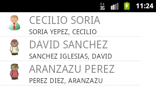Ahora se pretende que la lista sea más personalizada. Por defecto, la lista se crea de manera que únicamente se muestra una línea de texto por cada entrada. Ahora vamos a intentar mostrar una imagen, un texto principal y otro secundario para cada elemento de la lista. El resultado será similar al que se muestra en la siguiente imagen: