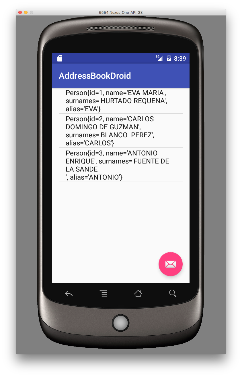 Si ejecutas en este momento la aplicación podrás ver que ya se muestra el contenido de la lista lista aunque de una manera poco agradable para el usuario, ya que para mostrar los objetos contenidos en la lista se usa de manera predefinida el valor retornado por el método toString de la clase Person.