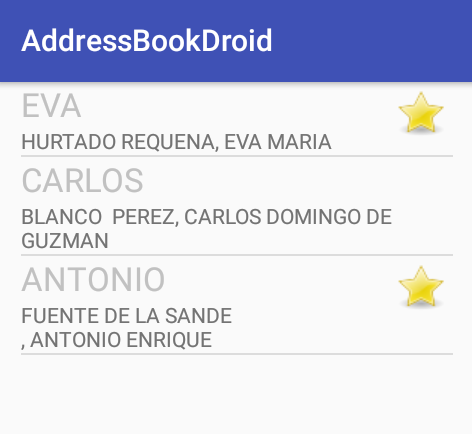 Ahora se pretende que la lista sea más personalizada. Por defecto, la lista se crea de manera que únicamente se muestra una línea de texto por cada entrada. Ahora vamos a intentar mostrar una imagen, un texto principal y otro secundario para cada elemento de la lista. El resultado será similar al que se muestra en la siguiente imagen: