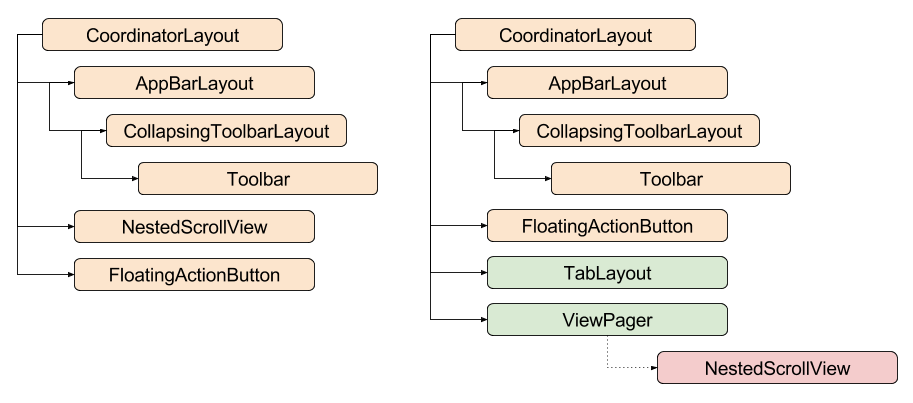 <android.support.design.widget.CoordinatorLayout xmlns:android="http://schemas.android.com/apk/res/android" xmlns:app="http://schemas.android.com/apk/res-auto" xmlns:tools="http://schemas.android.com/tools" android:layout_width="match_parent" android:layout_height="match_parent" android:fitsSystemWindows="true" tools:context=".PersonDetailActivity" tools:ignore="MergeRootFrame"> <android.support.design.widget.AppBarLayout android:id="@+id/app_bar" android:layout_width="match_parent" android:layout_height="@dimen/app_bar_height" android:fitsSystemWindows="true" android:theme="@style/ThemeOverlay.AppCompat.Dark.ActionBar"> <android.support.design.widget.CollapsingToolbarLayout android:id="@+id/toolbar_layout" android:layout_width="match_parent" android:layout_height="match_parent" android:fitsSystemWindows="true" app:contentScrim="?attr/colorPrimary" app:layout_scrollFlags="scroll|exitUntilCollapsed" app:toolbarId="@+id/toolbar"> <android.support.v7.widget.Toolbar android:id="@+id/detail_toolbar" android:layout_width="match_parent" android:layout_height="?attr/actionBarSize" app:layout_collapseMode="pin" app:popupTheme="@style/ThemeOverlay.AppCompat.Light" /> </android.support.design.widget.CollapsingToolbarLayout> </android.support.design.widget.AppBarLayout> <android.support.design.widget.TabLayout android:id="@+id/tabs" android:layout_width="match_parent" android:layout_height="?attr/actionBarSize" android:layout_gravity="bottom" android:background="?attr/colorPrimary" app:layout_anchor="@+id/app_bar" app:layout_anchorGravity="bottom" /> <!-- <android.support.v4.widget.NestedScrollView android:id="@+id/container_scroll" android:layout_width="match_parent" android:layout_height="match_parent" android:fillViewport="true" app:layout_behavior="@string/appbar_scrolling_view_behavior" />--> <android.support.v4.view.ViewPager android:id="@+id/person_detail_container" android:layout_width="match_parent" android:layout_height="match_parent" android:layout_marginTop="?attr/actionBarSize" app:layout_behavior="@string/appbar_scrolling_view_behavior" /> <android.support.design.widget.FloatingActionButton android:id="@+id/fab" android:layout_width="wrap_content" android:layout_height="wrap_content" android:layout_gravity="center_vertical|start" android:layout_margin="@dimen/fab_margin" android:src="@android:drawable/stat_notify_chat" app:layout_anchor="@+id/person_detail_container" app:layout_anchorGravity="top|end" /> </android.support.design.widget.CoordinatorLayout>