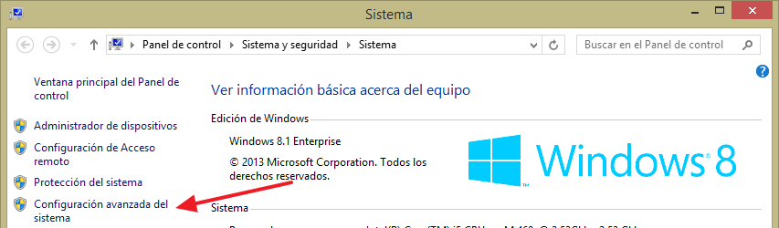 Una vez ahí, usa el enlace de la izquierda para acceder a la Configuración avanzada del sistema.