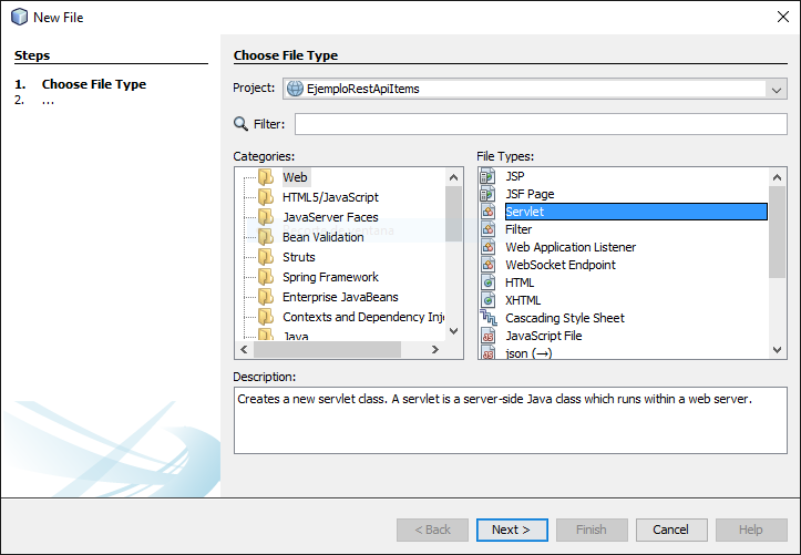 Crea o utiliza un proyecto de tipo Java Web > Web Application y dentro de los paquetes de fuentes (Source Packages) crea una clase Java de tipo Servlet (conviene crear siempre las clases Java dentro de un paquete determinado, por lo que deberás crear un paquete donde alojar la clase Servlet). En el caso de este ejemplo se ha creado una clase llamada RestItems. Al tratarse de un proyecto de ejemplo, se va a gestionar un tipo de información genérica, que se va a denominar Item, que almacenará información de distinto tipo, sin un significado concreto.