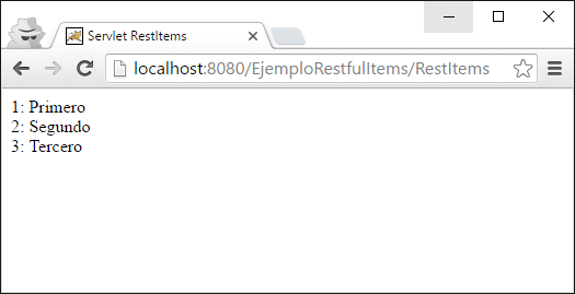 Si ejecutas de nuevo este Servlet (recuerda ejecutar la clase, no el proyecto), podrás ver en el navegador web el contenido de la lista que hayas indicado que se muestre: