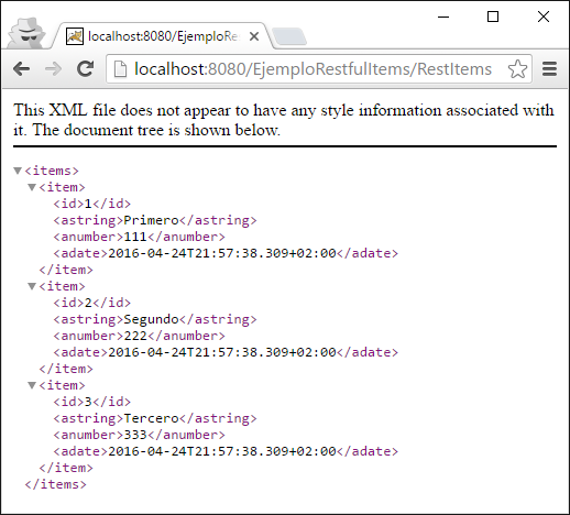 @XmlRootElement @XmlAccessorType(XmlAccessType.FIELD) public class Item { @XmlElement private int id; @XmlElement private String astring; @XmlElement private int anumber; @XmlElement private Date adate; public Item() { } public Item(int id, String astring, int anumber, Date adate) { this.id = id; this.astring = astring; this.anumber = anumber; this.adate = adate; } public int getId() { return id; } public void setId(int id) { this.id = id; } public String getAstring() { return astring; } public void setAstring(String astring) { this.astring = astring; } public int getAnumber() { return anumber; } public void setAnumber(int anumber) { this.anumber = anumber; } public Date getAdate() { return adate; } public void setAdate(Date adate) { this.adate = adate; } }