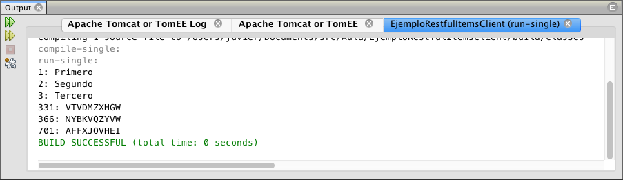 Para probar el funcionamiento de la aplicación cliente que usa POST, asegúrate de haber ejecutado previamente el Servlet, y luego ejecuta una o varias veces la aplicación del POST. Luego ejecuta la aplicación cliente que se había creado antes para probar la consulta de datos con GET, y se deberían mostrar en la salida estándar los 3 objetos que se crear inicialmente desde dentro del código del Servlet, más un objeto nuevo con contenido aleatorio por cada ejecución que hayas realizado de POST.