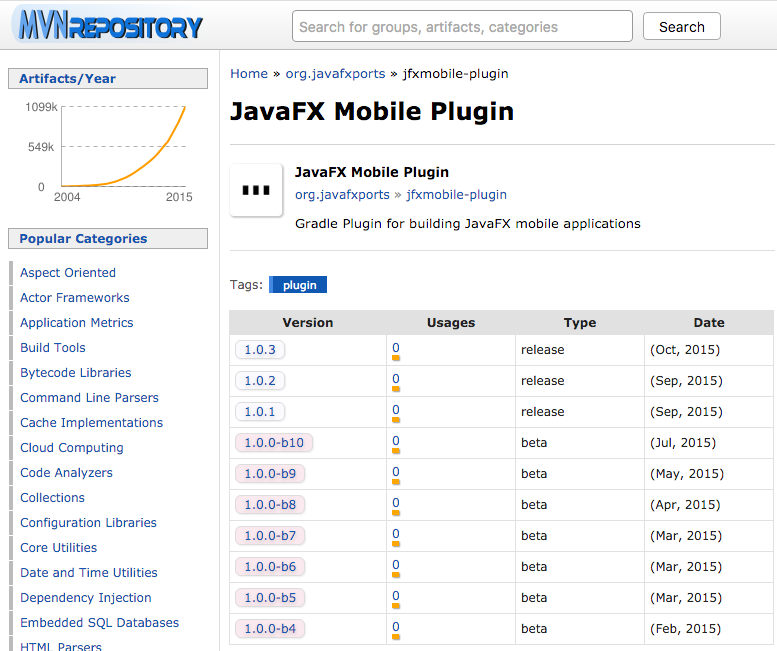 En este repositorio puedes encontrar las versiones publicadas de este plugin: http://mvnrepository.com/artifact/org.javafxports/jfxmobile-plugin