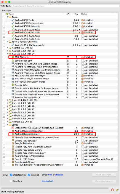 Una que se tenga instalado el SDK debes comprobar que se tengan instalados los siguientes paquetes (usa el SDK Manager para instalarlos, que puedes abrirlo ejecutando el archivo android que se encuentra dentro de la carpeta tools del SDK):