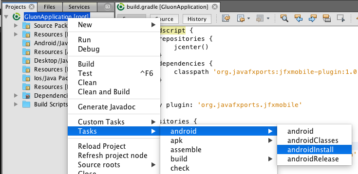Para ejecutarlo en un dispositivo Android que tengas correctamente conectado al ordenador, usa la opción Tasks > android > androidInstall desde el menú contextual del proyecto.