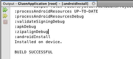 Si todo termina correctamente podrás ver el mensaje Installed on device y podrás ejecutar la aplicación GluonApplication desde el dispositivo.