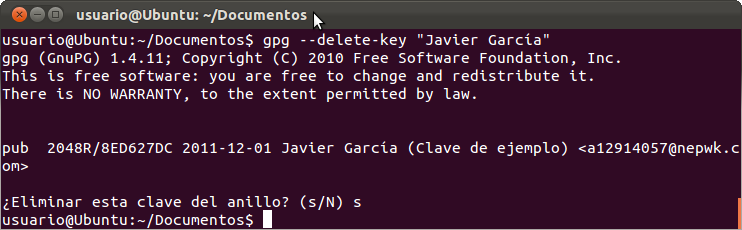 gpg --delete-key "Nombre Apellidos"