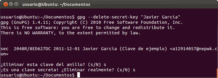 Es posible eliminar las claves que han sido generadas previamente. Para poder borrar la clave pública, primero debe borrarse la clave privada usando la opción --delete-secret-key seguido del nombre y apellidos (si has usado espacios recuerda usar comillas) asignado en la clave, también puedes usar el comentario (o parte incluso parte de él), o bien del correo electrónico que se había indicado: