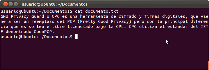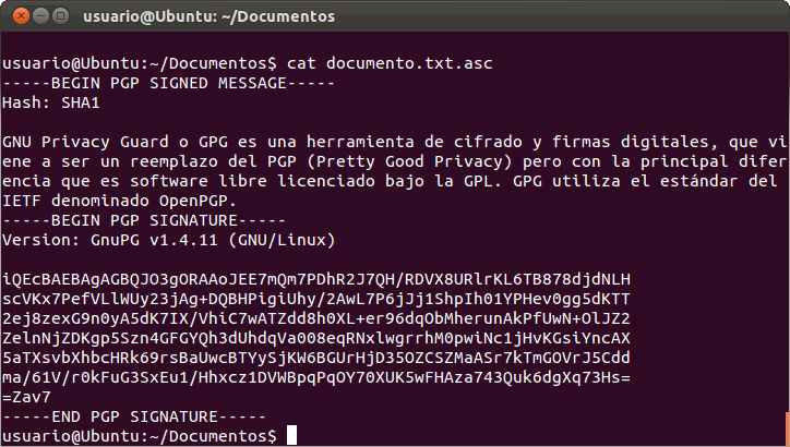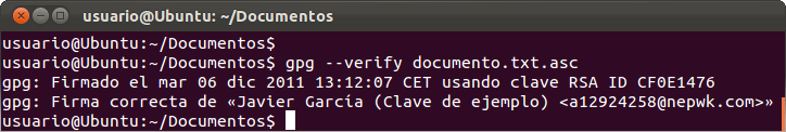 Cuando otra persona, que tiene nuestra clave pública, reciba un archivo formado por nosotros, o bien, si nosotros queremos comprobar un archivo que nos manda firmada otra persona y tenemos su clave pública, podemos verificar la firma y que el archivo está correcto indicando simplemente el nombre del archivo o con la opción --verify seguido del nombre del archivo firmado a verificar: