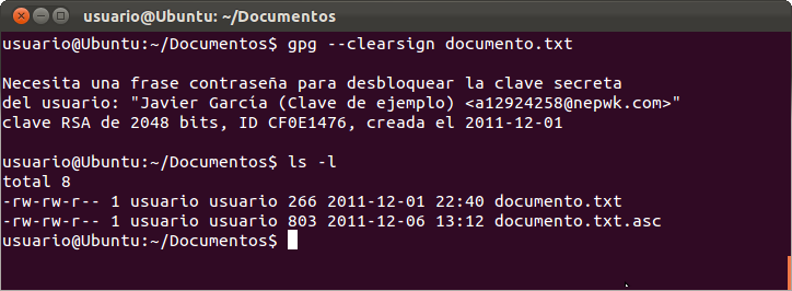 Al firmarlo, te solicita la contraseña de tu clave privada y genera otro archivo con el mismo nombre y la extensión .asc:
